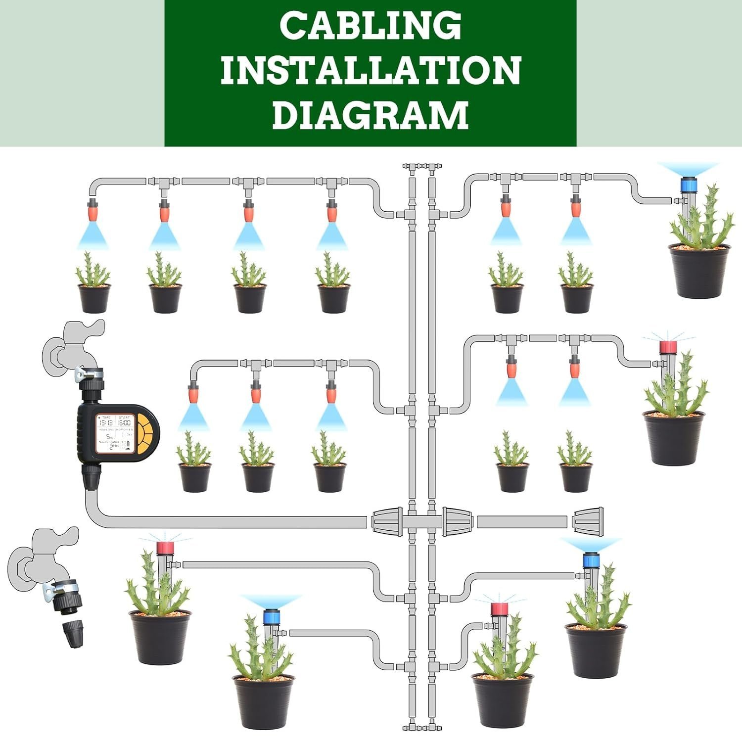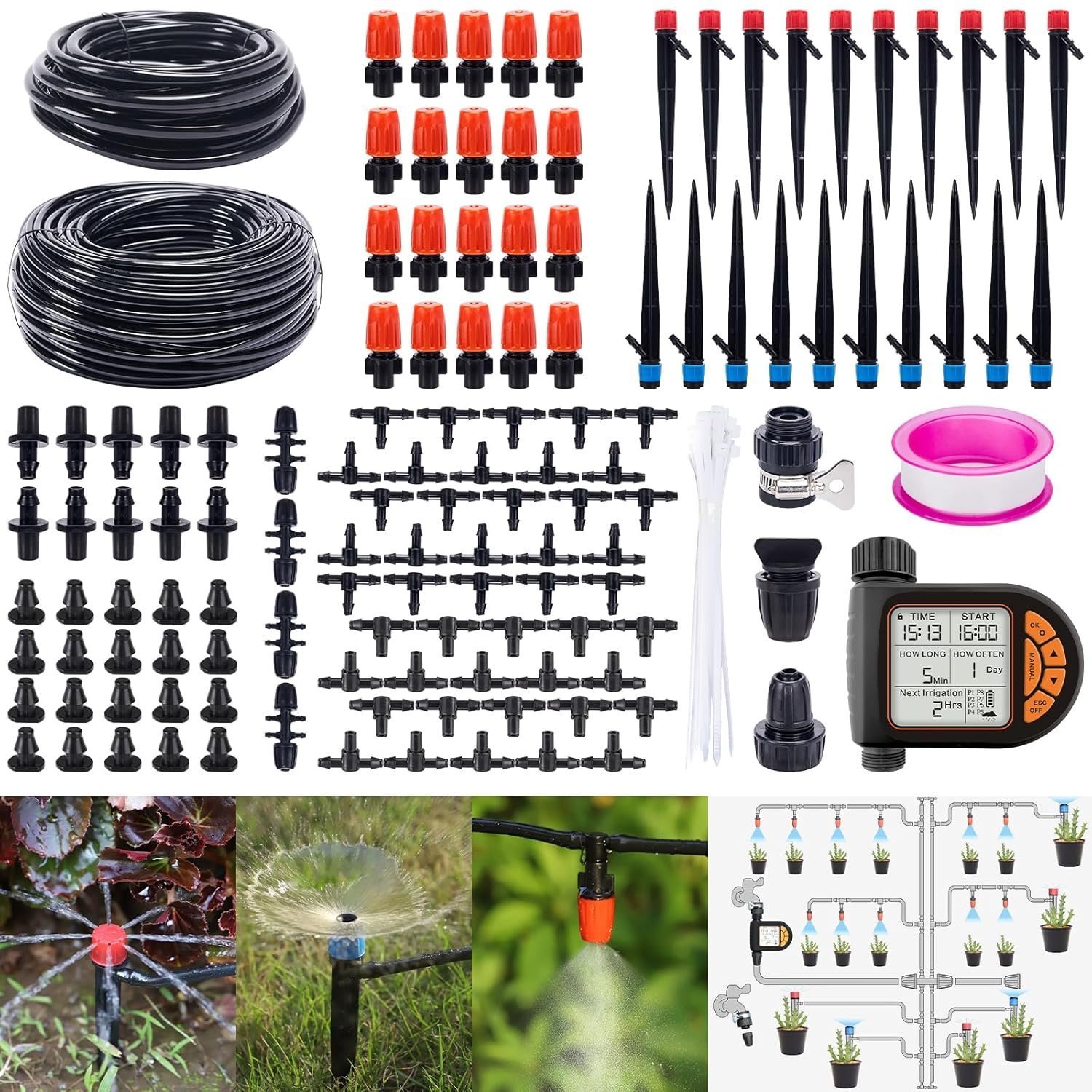 • All-in-one system with irrigation timer, drip irrigation kit, and three sprayer types